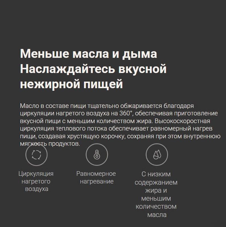 Это идеальное решение для тех, кто стремится к здоровому образу жизни, но не готов жертвовать вкусом любимых блюд. Xiaomi Smart Air Fryer 4.5L — ваш надёжный помощник в создании полезных и аппетитных блюд каждый день.